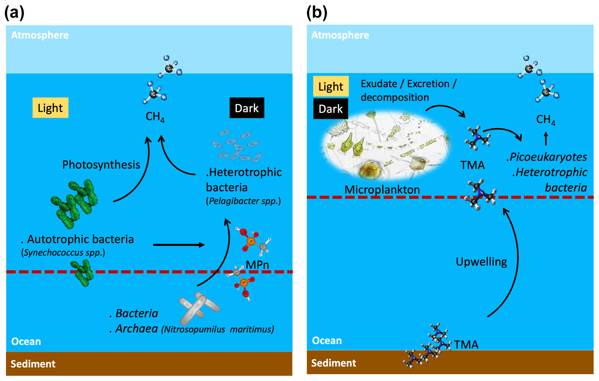 Figura 2. Ciclo del metano en: (a) Fases II y III o temporada de surgencia tardía o sin surgencia, y (b) Fase I o temporada con surgencia. Ambos paneles muestran las interacciones en condiciones de luz y oscuridad. La línea roja representa la división entre el metano que se produce en zonas con y sin oxígeno.