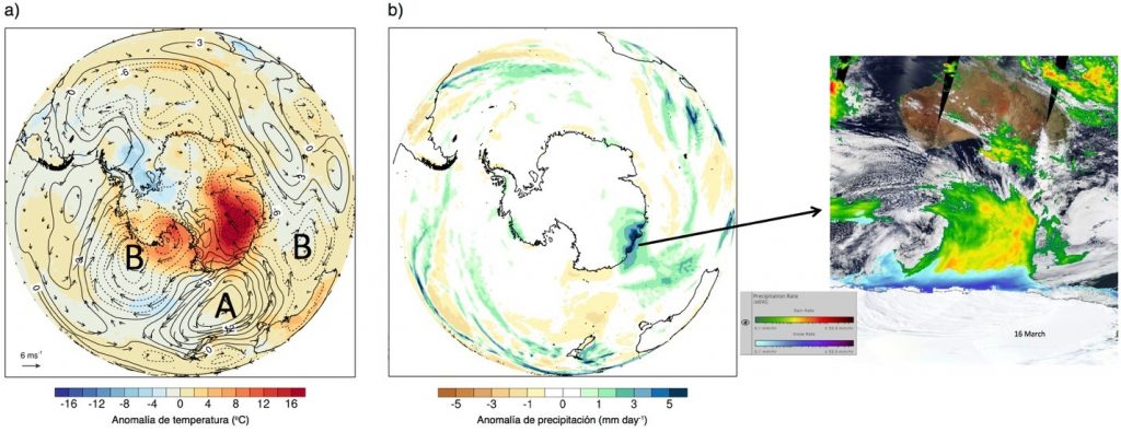 Entre el 14 y el 20 de marzo de 2022, se registró una anomalía de la temperatura del aire cerca de la superficie de la Antártica oriental de más de 15 °C (figura 1a). Durante este periodo, la estación Concordia (75.1°S, 123.1°E) alcanzó una temperatura récord de -11.5 °C el 18 de marzo, (rompiendo la temperatura máxima anual anterior de -13.7 °C), casi 40 °C más que lo normal para esta zona del mundo, lo que hizo que esta ola de calor fuera excepcional. Este fenómeno estuvo acompañado de eventos de intensa precipitación debido al aire húmedo transportado por vientos desde Australia hacia la Antártica (figura 1b). A pesar de este anómalo aire cálido anómalo, las temperaturas todavía estaban por debajo de cero, lo que resultó en una gran acumulación de nieve en el este del continente blanco.