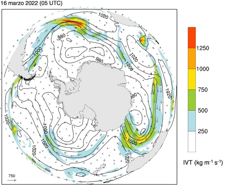 Durante esos días, se registró un intenso anticiclón (alta presión) sobre zonas del sur de Nueva Zelanda y Australia. Este fenómeno fue “presionado” en ambos lados por ciclones profundos que se extendieron desde las latitudes medias hacia la Antártica. Este patrón de circulación anómalo desencadenó, además, un «río atmosférico» (RA) -un corredor de flujo de humedad largo y estrecho- hacia el polo, que también tocó tierra en las costas del este de la Antártica durante los eventos cálidos extremos (figura 2).