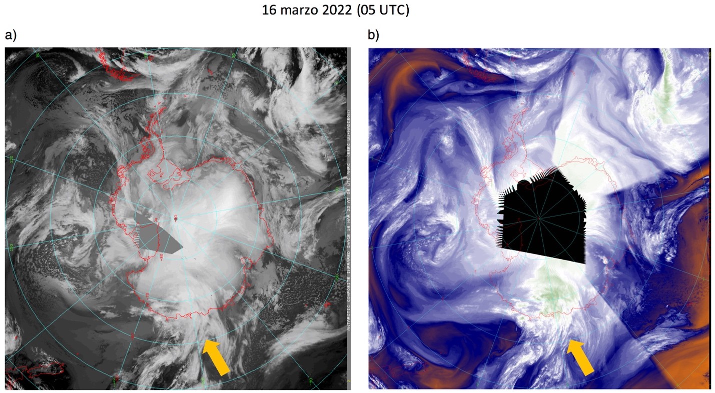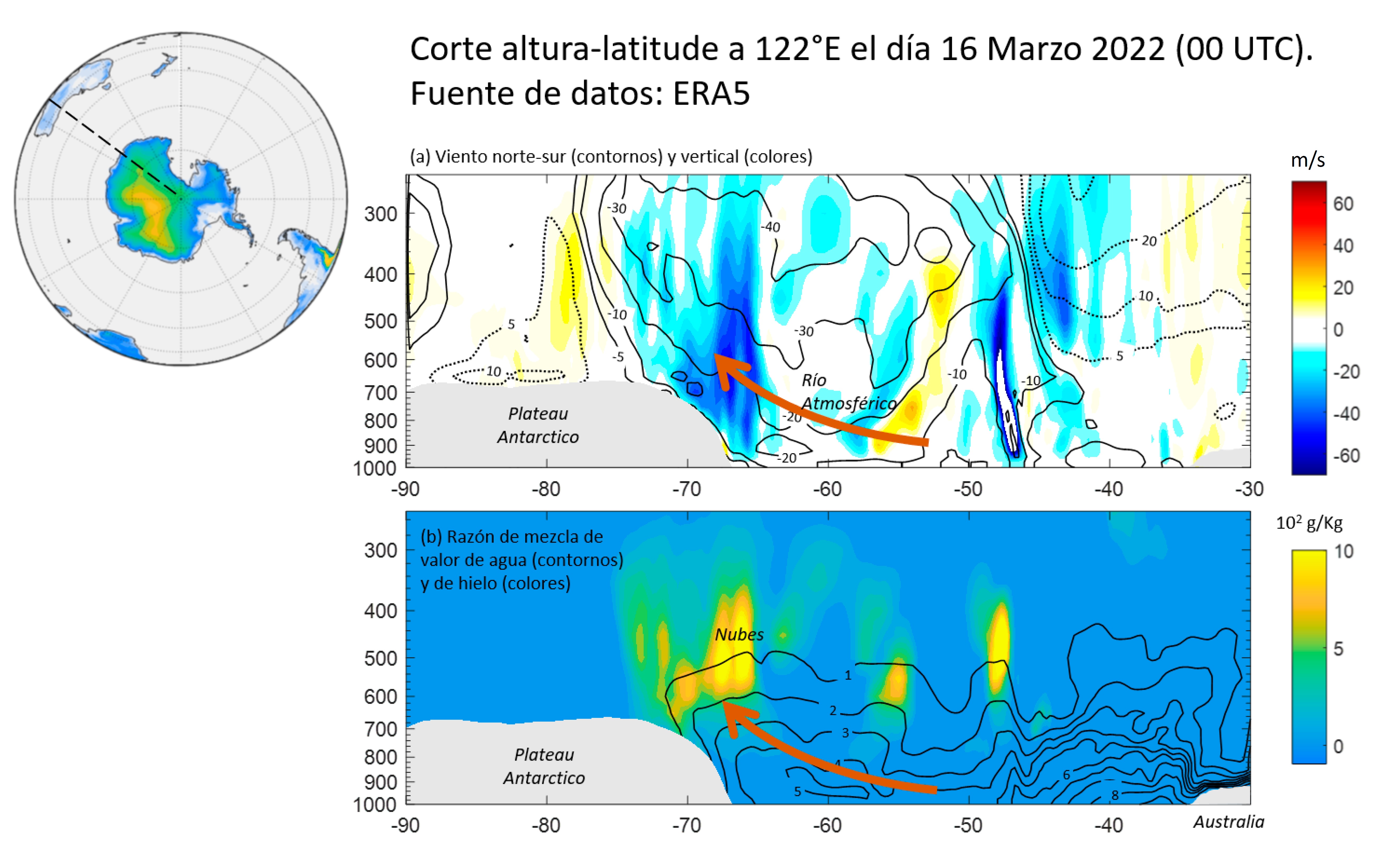 Este río atmosférico presentó una orientación predominante norte-sur, extendiéndose a lo largo de más de 3000 kilómetros entre Australia y la Antártica, lo que resultó en condiciones húmedas concentradas alrededor de la meseta antártica oriental (Figura 3). Los datos de imágenes infrarrojas del 16 de marzo de 2022 muestran claramente la formación de un parche de nubes sobre el océano Austral que se extiende hacia el este de la Antártica (figura 4a). Para esa misma fecha también se confirmó una intensa columna de vapor de agua originada en el sur de Australia (figura 4b).