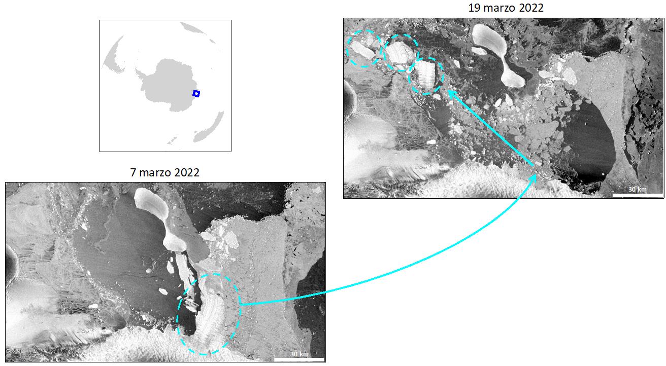 Figura 5. Plataforma de hielo Conger (círculo cian, aproximadamente 1200 km2) antes (7 de marzo de 2022) y después (19 de marzo de 2022) de los eventos de calor extremo. Después de los eventos, la plataforma de hielo se derrumbó y los pedazos de la plataforma de hielo fueron arrastrados hacia el área indicada por la flecha. Fuente: Radar Sentinel-1 adquiridas en los modos Interferometric Wide Swath (IW) y Extra Wide Swath (EW), procesados a Level-1 Ground Range Detected (GRD). Datos de Copernicus Sentinel 2022, procesados por la ESA y obtenidos de https://apps.sentinel-hub.com/eo-browser/.