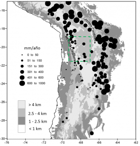Figura 1. Promedio histórico (1980-2000) de la precipitación en estaciones pluviométricas sobre los Andes centrales. El tamaño de los símbolos es proporcional a la acumulación anual de lluvia y los tonos de grises indican elevación del terreno (kilómetros sobre el nivel del mar). El cuadrado verde indica la zona del salar de Uyuni ampliada en la Figura 2. Adaptado de Vuille & Keimig (2004).