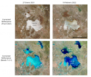 Figura 2. Imágenes del satélite Terra/MODIS (NASA) sobre la zona del salar de Uyuni (ver ubicación en Figura 1). Los paneles superiores corresponden a la imagen de “color verdadero”, mientras que los inferiores son una combinación de bandas que destaca la presencia de agua líquida en color azul. Los paneles de la derecha corresponden al verano 2022, luego de fuertes lluvias en el Altiplano. Los paneles de la izquierda son del verano 2021 con lluvias promedio. Fuente: https://worldview.earthdata.nasa.gov/