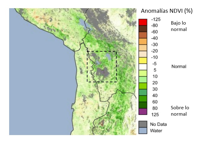 Figura 3. Anomalías del índice normalizado de vegetación (NDVI) para la segunda semana de febrero de 2022. Los colores verdes indican vegetación más “verde” que el promedio histórico. El cuadrado indica la zona ampliada en la Figura 2. Fuente: NASA GIMMS Global Agricultural Monitoring.