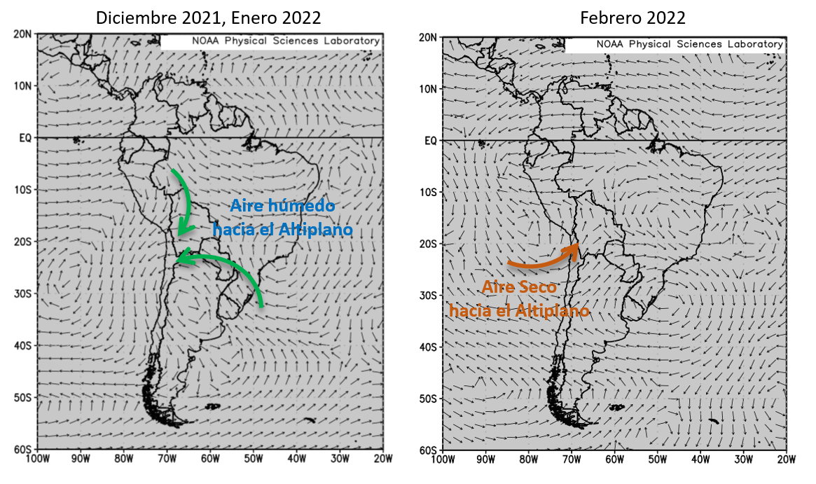 Para entender el origen de esta anomalías pluviométricas en el sur del Altiplano, recordemos que en esta zona las lluvias ocurren mayoritariamente cuando los vientos sobre la cordillera soplan desde el interior del continente (vientos del este), favoreciendo el ingreso de humedad desde las tierras bajas de Bolivia (Altiplano chileno: Cuando llueve, diluvia). Esto es, precisamente, lo que ocurrió en diciembre 2021 y enero 2022, tal como lo muestra el mapa de anomalías (diferencia con el promedio histórico) de viento en la tropósfera alta para ese periodo (Figura 4). En contraste, los vientos sobre los Andes centrales fueron mayormente desde el oeste durante febrero, limitando la precipitación hacia fines de verano.