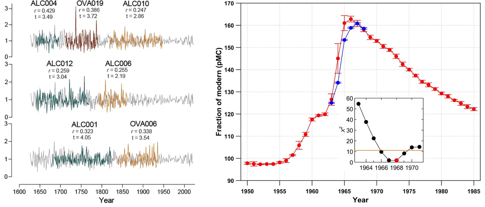De cada sitio de muestreo se obtuvo un mínimo de 15 durmientes en buen estado de conservación y se analizaron sus anillos en laboratorio. Para determinar si estos servían como archivos climáticos y ambientales de largo plazo, se realizó un cruce de información cronológica con patrones de crecimiento de anillos de robles vivos del sur de Chile (Figura 2A). Con ello se lograron datar o fechar las muestras de anillos de crecimiento provenientes de los durmientes. Para corroborar estas dataciones, se comparó también el nivel de radiocarbono de los durmientes con la curva del hemisferio sur de radiocarbono para el período conocido como el “pico de la bomba”, el cual es el período de detonaciones nucleares masivas ocurridas durante la Guerra Fría y que ha quedado registrado globalmente en los anillos de árboles de ese período (Figura 2B).