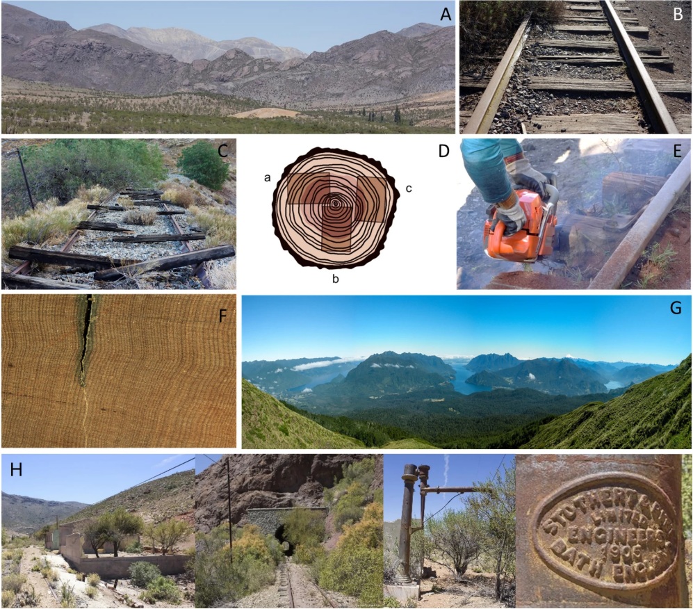 Figura 1. (A) Paisaje típico del Norte Chico, (B,C,E) vías férreas abandonadas desde donde se obtuvieron las muestras de durmientes de robles, (D) esquema de un tronco de roble para elaboración de durmientes, (F) detalles de anillos de robles de crecimiento anual contenidos en un durmiente, (G) bosques de Nothofagus de la Región de Los Ríos, (H) antiguo patrimonio ferroviario del Norte Chico formado por antiguas estaciones, túneles e infraestructura abandonada. Fuente: Schneider-Valenzuela et al. (2025).