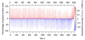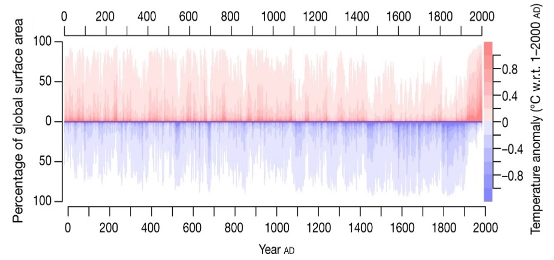 Junto con esto, los autores determinaron que el actual cambio climático no sólo ha alcanzado valores de temperaturas cálidas sin precedentes dentro de los últimos 2.000 años, sino que también es único en cuanto a la extensión de la superficie del planeta que ha sido afectada (figura 1).