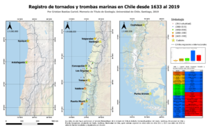 Sin embargo, existe mucha evidencia anecdótica sobre estos fenómenos, la que ha sido recopilada recientemente por Priscilla Nowajewski, el Servicio Meteorológico de la Armada y por Cristián Bastías, quien está desarrollando un trabajo de tesis titulado “Influencia de la geología en la mitología y cosmovisión mapuche, entre Concepción y Chiloé”, que evidencia que la existencia de estos fenómenos no es nueva. De hecho, el primer registro data del 14 de mayo de 1633 en Carelmapu y, hasta la fecha, habrían ocurrido más de 50 (Figura 1). Cabe destacar que la ubicación de trombas y tornados sigue un patrón definido, concentrándose entre las regiones del Biobío y Los Lagos, y con una máxima frecuencia de ocurrencia en los meses de otoño. Esto último puede deberse a que el océano aún se encuentra cálido tras el verano, sumado al ingreso de aire frío polar asociado a la temporada de lluvias en Chile central y sur, lo que garantiza la existencia de inestabilidad, primer ingrediente de estas tormentas. El otro ingrediente que aparece con claridad en las investigaciones existentes en el mundo es el cizalle o cortante de viento, que es una medida sobre qué tanto cambia el viento con la altura en la zona en donde está ocurriendo la tormenta convectiva.
