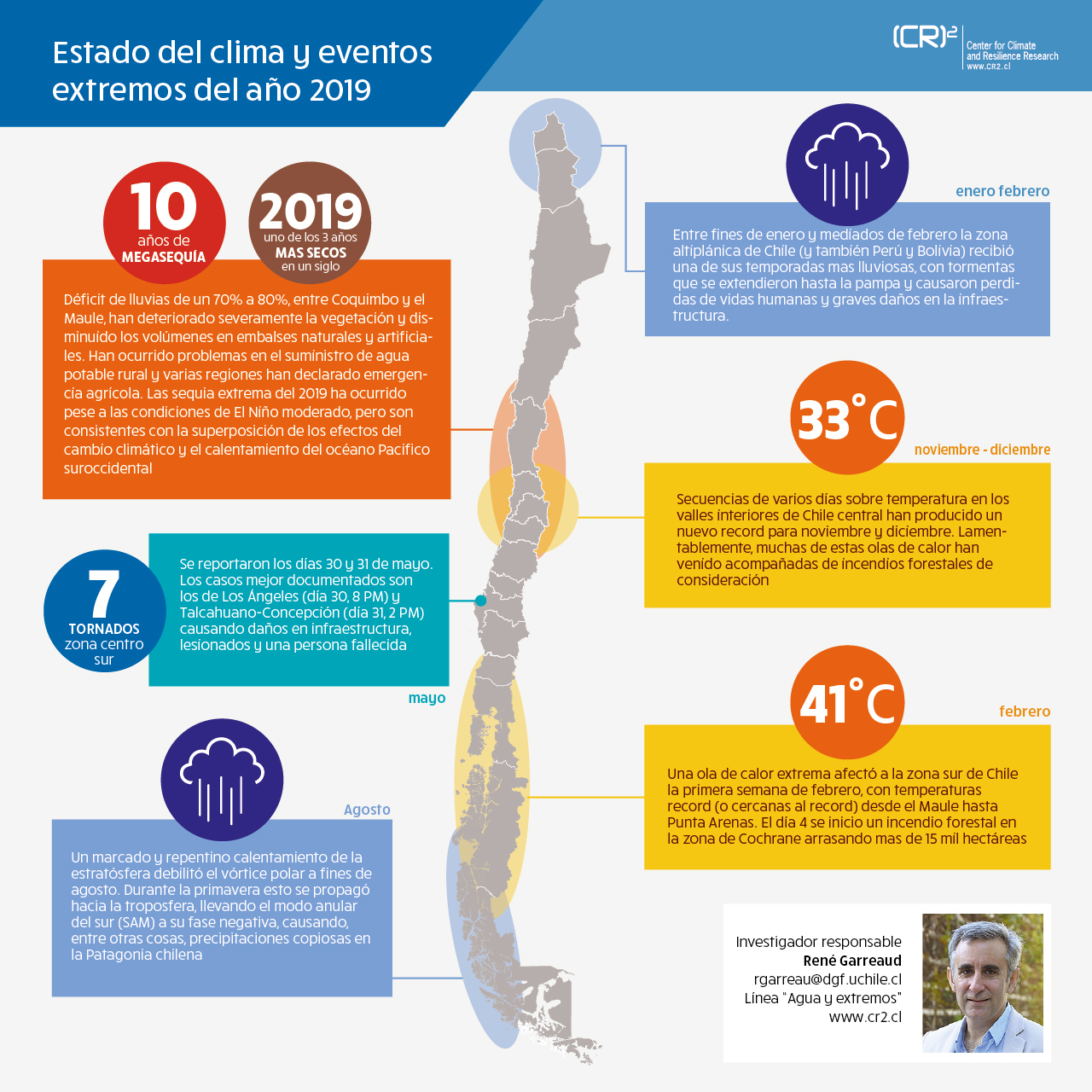 Garreaud, R., 2019: Estado del clima y eventos extremos el año 2019. Infografía CR2, disponible en: http://www.cr2.cl/wp-content/uploads/2020/01/Eventos-extremos-2019.jpg