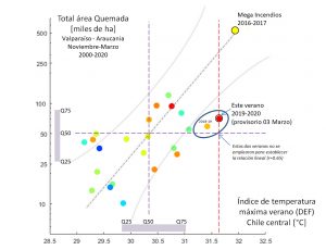 Históricamente la temperatura máxima durante el verano de la zona centro-sur de Chile ha tenido una relación positiva con la superficie quemada, como es el caso entre las regiones de Valparaíso y la Araucanía (Urrutia-Jalabert et al. 2018; González et al. 2018). Esta relación se resume en la Figura 1, donde cada símbolo corresponde a una temporada de incendios entre los años 2000 y 2020, de acuerdo a un índice de temperatura máxima (promedios estacionales de Quinta Normal, Curicó, Chillán y Temuco) y el área total quemada entre las regiones mencionadas anteriormente. Pese a que la correlación es significativa, temporadas de verano con temperaturas similares pueden presentar una alta dispersión respecto a la superficie afectada por incendios, ya que existen otros factores que influyen en la ocurrencia y propagación del fuego. Uno de ellos es la precipitación acumulada en los meses previos a la estación de incendios, que regula el contenido de humedad del suelo y el estrés hídrico de la vegetación (Urrutia-Jalabert et al. 2018).