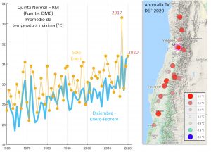 Figura 2: En el panel izquierdo, la línea celeste muestra el promedio de temperaturas registrado en el periodo diciembre-febrero, entre los años 1960 y 2020; mientras que la línea amarilla muestra los promedios de enero, destacando el año 2017. El panel derecho muestra la anomalía de la temperatura máxima promedio durante el verano 2019/2020 respecto al promedio climatológico (1980-2010). Fuente: Dirección Meteorológica de Chile y Dirección General de Aguas.