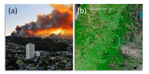 Figura 3: La fotografía de la izquierda muestra los incendios en la interfaz urbano-rural de Valparaíso ocurridos el 24 de diciembre de 2019. La figura de la derecha es una imagen del satélite TERRA de fines de febrero de 2020, donde se aprecia la cicatriz de más de 10 mil hectáreas en la precordillera de Curicó (Región del Maule), tras el incendio en el sector de Agua Fría.