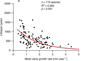 Figura 1. Relación entre la tasa de crecimiento (promedio de los anchos de anillos de los primeros 10 años) y la longevidad máxima para 110 especies arbóreas alrededor del mundo. En rojo se observa la curva exponencial negativa ajustada a los datos, la que indica que, a mayor tasa de crecimiento, menor es la longevidad de las especies. Fuente: Figura tomada de la publicación original.