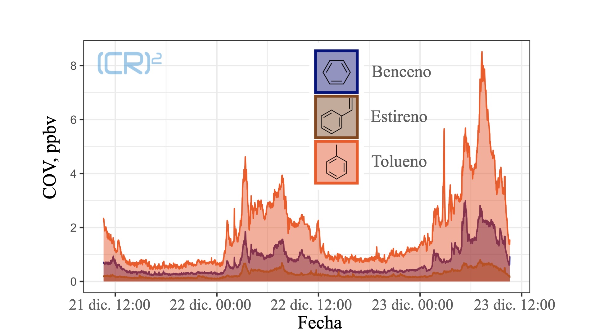 Los COV de origen antropogénico son emitidos desde fuentes diversas que incluyen combustibles fósiles, escapes de vehículos, solventes empleados por la industria química y aerosoles de uso doméstico. A escala urbana, la exposición a determinados COV es una amenaza para la salud de las personas debido a sus propiedades tóxicas. El benceno, por ejemplo, es un conocido cancerígeno [5]. Por este motivo la Unión Europea estableció que el benceno en el aire no debe exceder las 1,6 partes por billón en volumen (ppbv) como promedio anual.