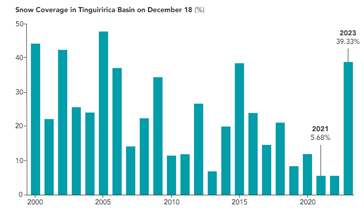 Data from the Observatorio de Nieve en los Andes de Argentina y Chile (above) show that mid-December snow coverage in the Tinguiririca Basin in 2023 stood well above levels seen in the past several years. The observatory supports a digital platform using data from NASA’s MODIS (Moderate Resolution Imaging Spectroradiometer) sensors to track snow cover in Andean drainage basins over time.
