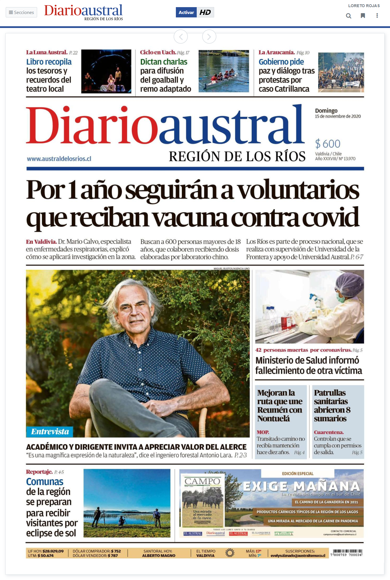 Inicio Antonio Lara, académico de la Universidad Austral de Chile y ex presidente de la Corporación Alerce: «Los alercer son una magnífica expresión de la naturaleza en todo sentido…» (Diario Austral) Página-1-australvaldivia-cl-El-Austral-de-Los-Ríos-Valdivia-Chile-15-11-2020