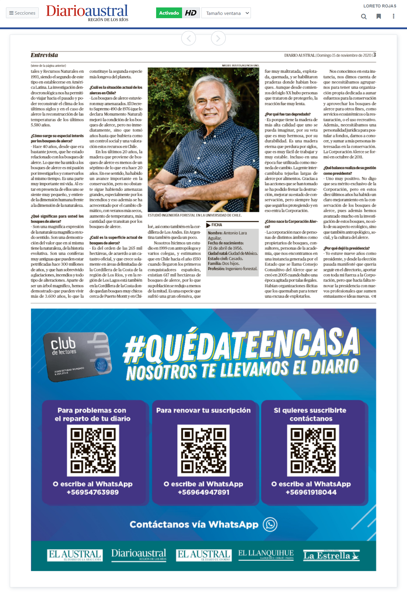 Inicio Antonio Lara, académico de la Universidad Austral de Chile y ex presidente de la Corporación Alerce: «Los alercer son una magnífica expresión de la naturaleza en todo sentido…» (Diario Austral) Página-3-australvaldivia-cl-El-Austral-de-Los-Ríos-Valdivia-Chile-15-11-2020