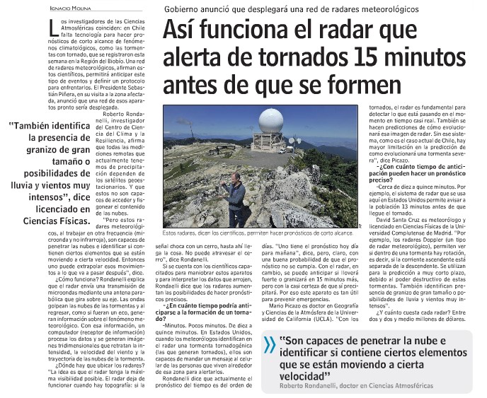 Los investigadores de las Ciencias Atmosféricas coinciden: en Chile falta tecnología para hacer pronósticos de corto alcance de fenómenos climatológicos, como las tormentas con tornado, que se registraron esta semana en la Región del Biobío. Una red de radares meteorológicos, afirman estos científicos, permitirá anticipar este tipo de eventos y definir un protocolo para enfrentarlos. El Presidente Sebastián Piñera, en su visita a la zona afectada, anunció que una red de esos aparatos pronto sería desplegada.