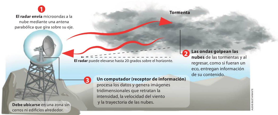 ¿Cómo funciona? Rondanelli explica que el radar envía una transmisión de microondas mediante una antena parabólica que gira sobre su eje. Las ondas golpean las nubes de las tormentas y al regresar, como si fueran un eco, generan información sobre el fenómeno meteorológico. Con esa información, un computador (receptor de información) procesa los datos y se generan imágenes tridimensionales que retratan la intensidad, la velocidad del viento y la trayectoria de las nubes de la tormenta. ¿Dónde hay que ubicar los radares? «La idea es que el radar tenga la máxima visibilidad posible. El radar deja de funcionar cuando hay topografía: si la señal choca con un cerro, hasta ahí llega la cosa. No puede atravesar el cerro», dice Rondanelli.