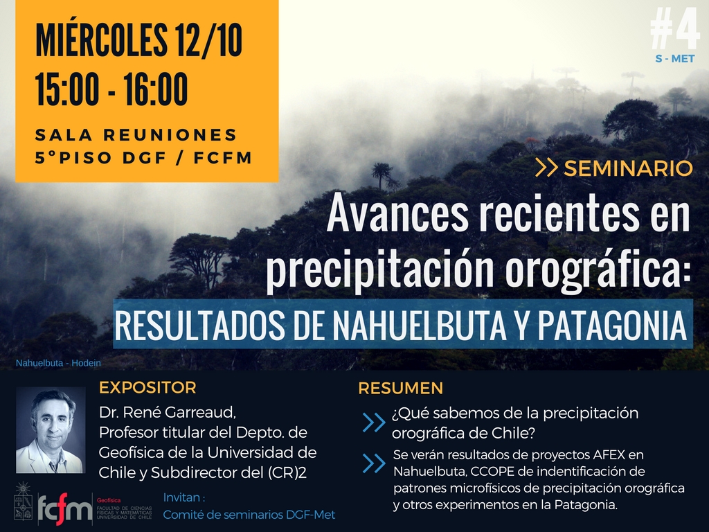 Este miércoles 12 de octubre a las 15:00 hrs., se realizará el Seminario «Avances recientes en precipitación orográfica: Resultados de Nahuelbuta y Patagonia», en la sala de reuniones del 5to piso del DGF/FCFM (Av. Blanco Encalada 2002, Santiago, Chile).