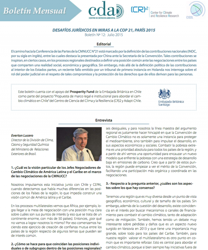 Edición de julio de 2015 del boletín “Desafíos jurídicos en miras a la COP 21, París 2015″, preparado por el equipo jurídico de la línea Dimensión Humana del (CR)2. En esta oportunidad, presentamos la entrevista a Everton Lucero, Director de la División de Clima, Ozono y Seguridad Química del Ministerio de Relaciones Exteriores de México, y Noémie Kugler, estudiante del programa de Doctorado de la Universidad Aix-Marseille, Francia.