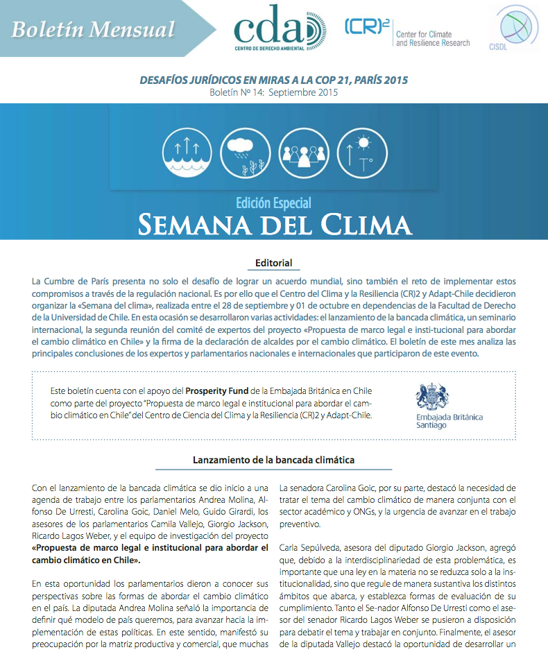 Edición especial Semana del Clima del boletín «Desafíos jurídicos en miras a la COP 21, París 2015» desarrollado con el apoyo del Prosperity Fund de la Embajada Británica en Chile como parte del proyecto «Propuesta de marco legal e institucional para abordar el cambio climático en Chile» del Centro de Ciencia del Clima y la Resiliencia (CR)2 y Adapt-Chile.