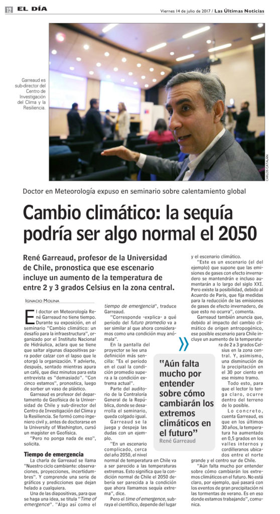 René Garreaud, profesor de la Universidad de Chile, pronostica que ese escenario incluye un aumento de la temperatura entre 2 y 3 grados Celsius en la zona central.