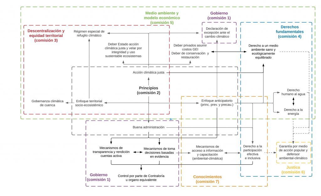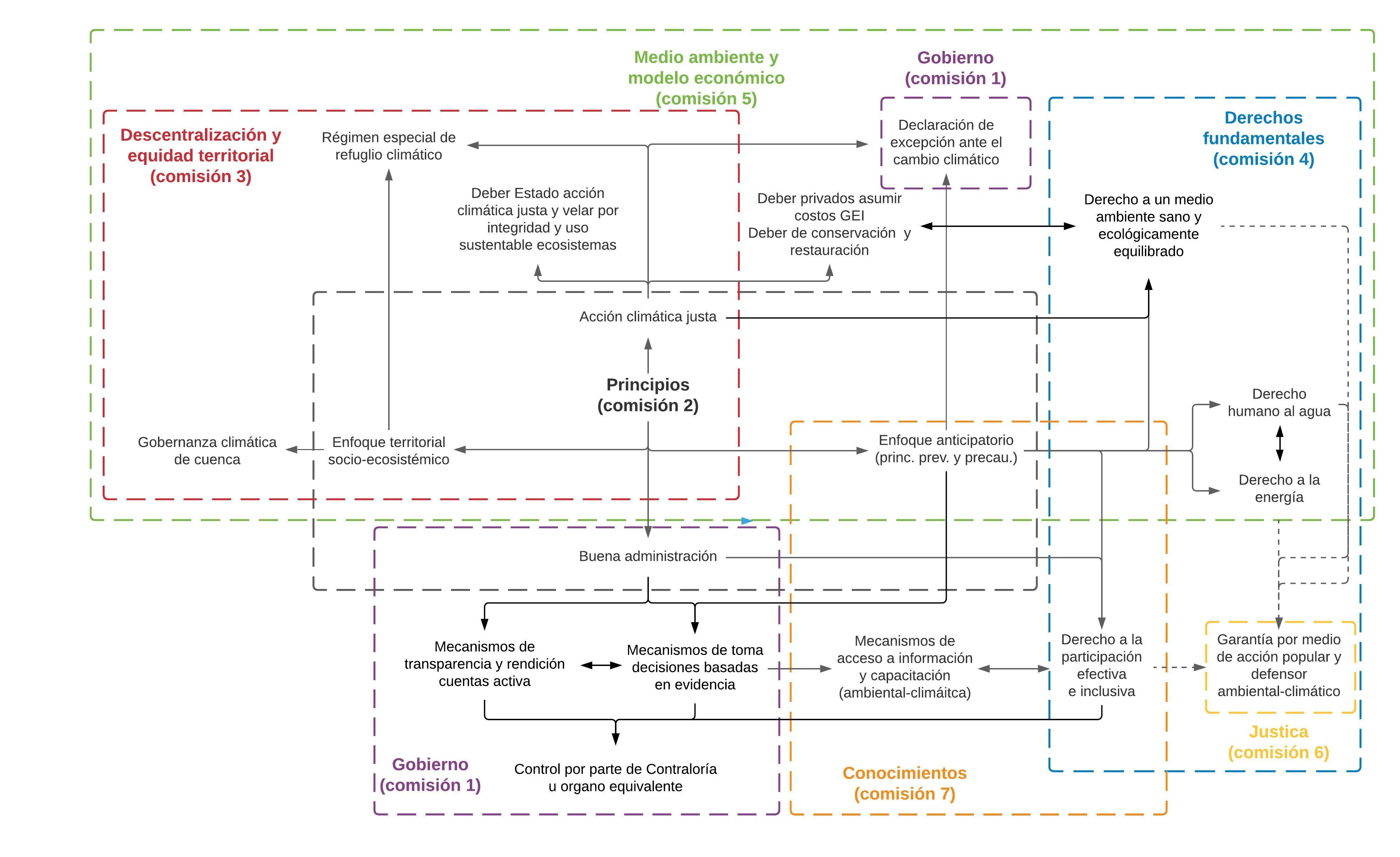 Estas se organizan en cuatro categorías: propuestas relacionadas con principios, que indican los fundamentos para la construcción del texto constitucional y la sociedad y Estado que este definirá; propuestas relacionadas con deberes (del Estado y de los privados); propuestas relacionadas con derechos; y propuestas de nuevos instrumentos, especialmente asociados a la gestión ambiental y la organización del territorio.