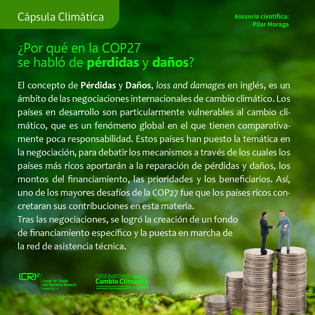 La Ministra del Medio Ambiente de Chile, Maisa Rojas, cofacilitó, junto a Alemania, las conversaciones en esta materia durante la COP 27, desarrollada en Egipto entre el 6 y el 18 de noviembre de 2022, dentro del marco de Santiago Network Loss and Damages (SNLD), creado en la COP25 (decisión 2/CMA.1, párrafo 43 a 45). En esta instancia se buscó definir la gobernanza del mecanismo de pérdidas y daños, dar visibilidad y realce al rol y necesidades del continente africano, llegar a acuerdos en torno a la regulación de los seguros por pérdidas y daños, y crear un fondo de financiamiento.