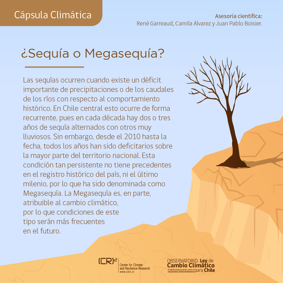 La Megasequía se atribuye principalmente a dos factores: variaciones lentas en el sistema océano-atmósfera similares al fenómeno del Niño y la Niña (esta última fase explica periodos secos en Chile central), y una tendencia de largo plazo asociado al cambio climático global (Boisier et al., 2016; Garreaud et al., 2019). Así, considerando escenarios actuales de emisiones globales de gases de efecto invernadero y de cambio climático, se prevé un futuro más seco en Chile, con un aumento en la frecuencia de eventos de sequías extremas y persistentes, como los de la presente década (Bozkurt et al, 2018; Boisier et al., 2018)