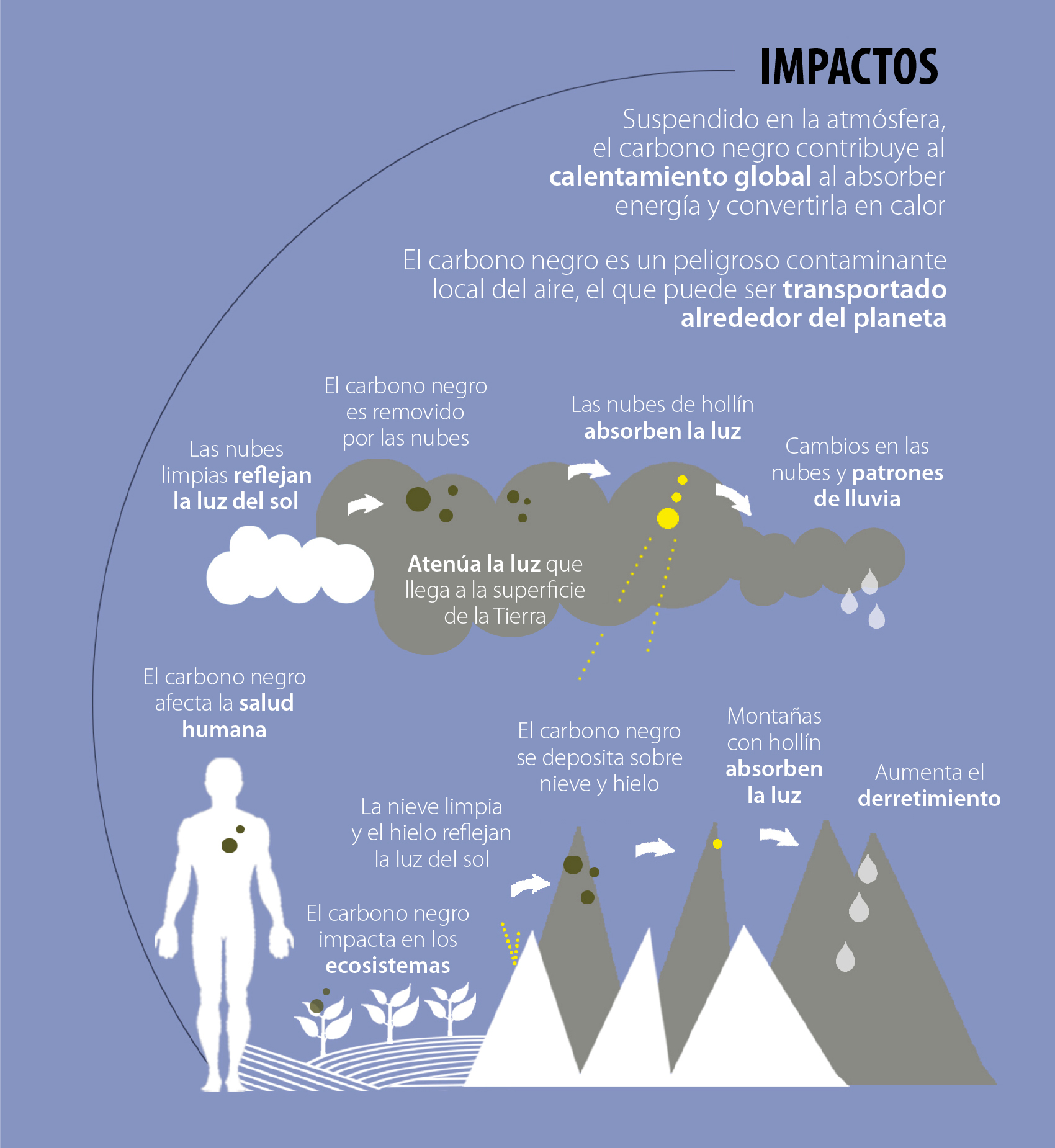 Esquema de los múltiples impactos asociados al carbono negro. La figura se basa en una análoga presentada por la Coalición del Aire Limpio y el Clima (https://www.ccacoalition.org/en/slcps/blackcarbon).