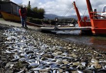 La desembocadura del río Queule, al sur de Chile, está llena de toneladas de sardinas muertas.