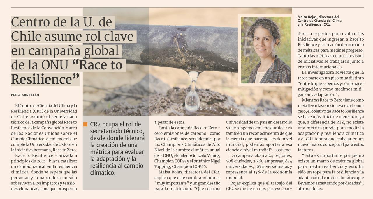 El Centro de Ciencia del Clima y la Resiliencia (CR2) de la Universidad de Chile asumió el secretariado técnico de la campaña global Race to Resilience de la Convención Marco de las Naciones Unidas sobre el Cambio Climático, el mismo rol que cumple la Universidad de Oxford en la iniciativa hermana, Race to Zero. Race to Resilience -lanzada a principios de 2021- busca catalizar un cambio radical en la resiliencia climática, donde se espera que las personas y la naturaleza no sólo sobrevivan a los impactos y tensiones climáticas, sino que prosperen a pesar de estos.