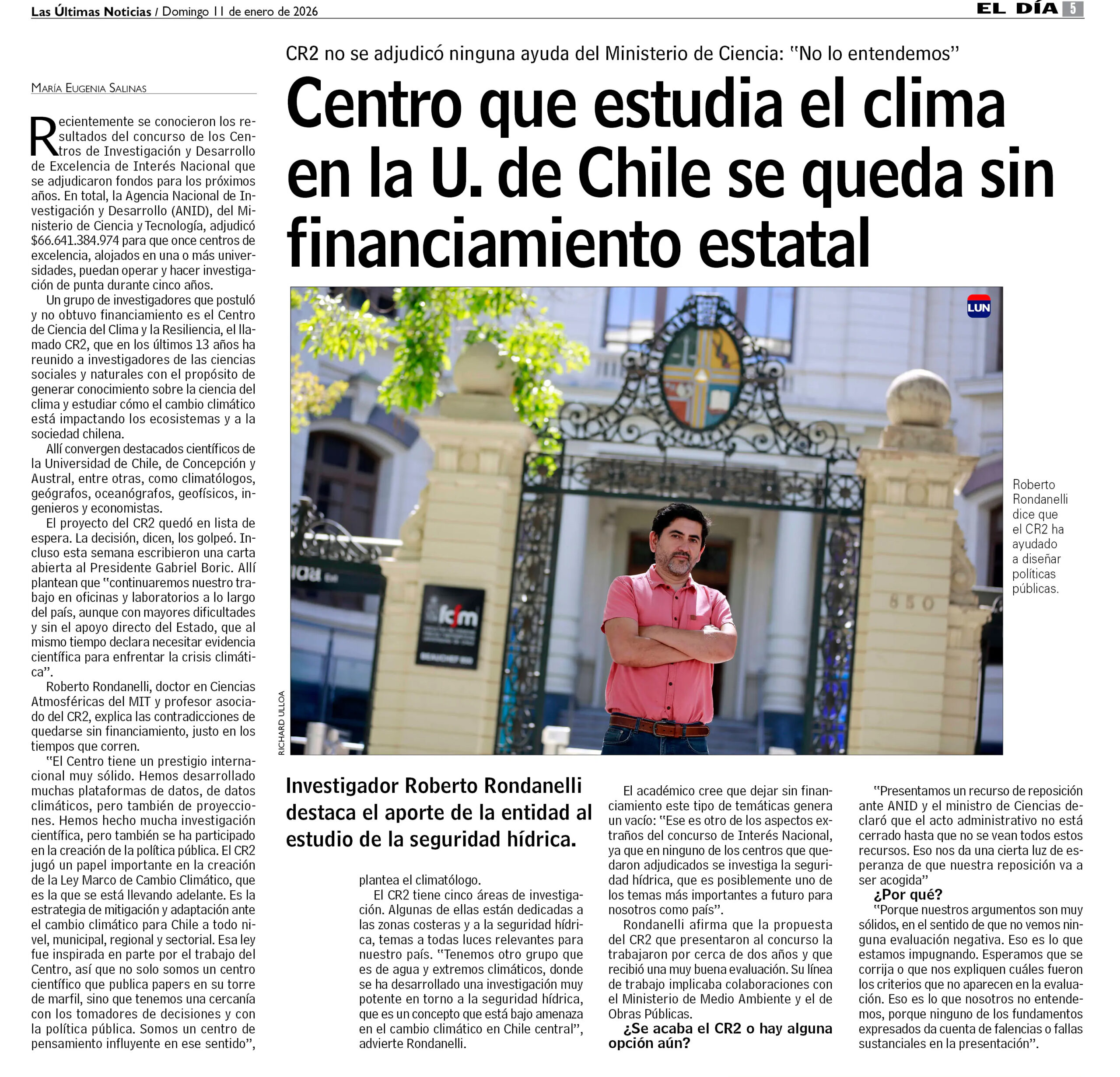 Centro que estudia el clima en la U de Chile se queda sin financiamiento estatal (LUN) 11 de enero de 2026 79 Leer esta noticia en LUN