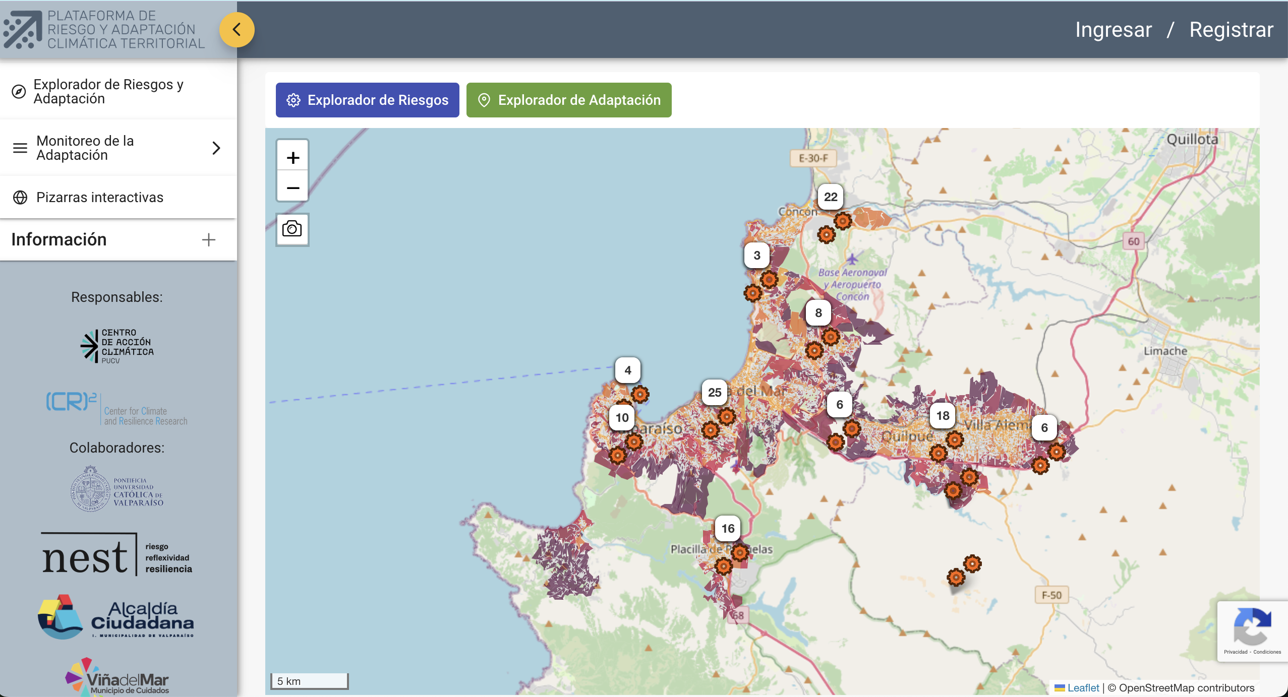 Por su parte, Susana Bustos, directora de Gestión y Vinculación del CR2, destaca que esta no es la primera vez que ambos centros colaboran. “Algo que creo importante de relevar es el trabajo conjunto que se ha realizado en busca de proveer información y herramientas para la adaptación al cambio climático y donde también es posible visualizar mapas de alta resolución que evalúan el riesgo de la población ante amenazas del cambio climático tales como: inseguridad hídrica, calor extremo, marejadas, inundaciones, incendios forestales y remoción en masa. Actualmente, la plataforma considera cinco comunas de la quinta región, pero hay un trabajo permanente de mejorarla y ampliarla a otras zonas”, señala.