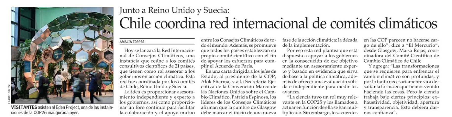 Hoy se lanzará la Red Internacional de Consejos Climáticos, una instacia que reúne a los comités consultivos científicos de 21 países, que tienen como rol asesorar a los gobiernos en acción climática. Esta red fue coordinada por los comités de Chile, Reino Unido y Suecia.