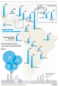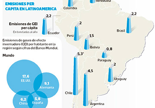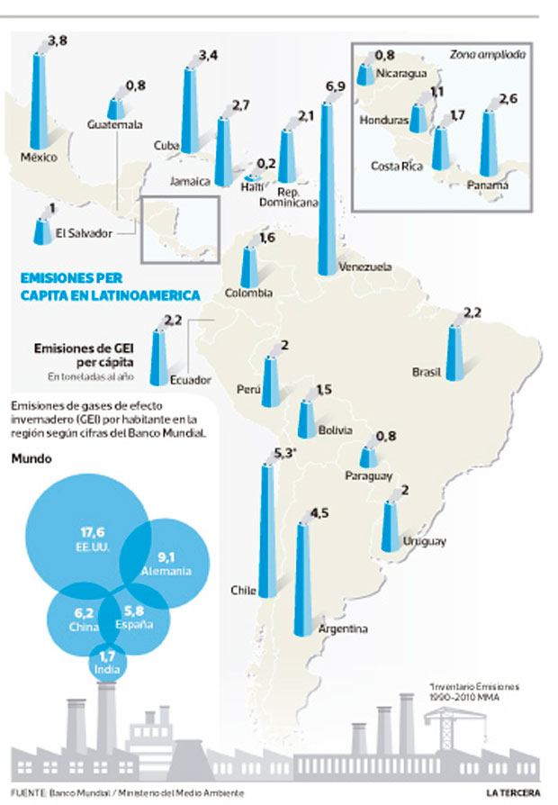 Según el Inventario Nacional de Gases de Efecto Invernadero 1990-2010, preparado por la Oficina de Cambio Climático del Ministerio del Medio Ambiente para ser presentado en la COP 20, las emisiones totales de Chile subieron de 49,8 millones de toneladas en 1990 a 91,5 millones en 2010. Un alza de 83,5%, que significó pasar de 3,8 toneladas per cápita en los 90 a 5,3 toneladas en 2010, según calculó Laura Farías, académica de la U. de Concepción y del Centro de Ciencia del Clima y la Resiliencia (CR2). En Latinoamérica, Chile sólo es superado por Venezuela (6,9), cuya matriz energética es petrolera.