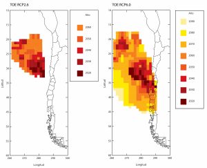 Este trabajo señala que el TOE de las precipitaciones ya se ha producido en algunas regiones, mientras que en otras ocurrirá en distintas décadas del siglo XXI, lo que tendría implicancias en los cultivos agrícolas de trigo, soya, arroz y maíz a nivel global. Se llegó a esta conclusión tras hacer una evaluación de las proyecciones climáticas realizadas por los distintos escenarios RCP planteados por el Panel Intergubernamental de Cambio Climático (IPCC)[1].