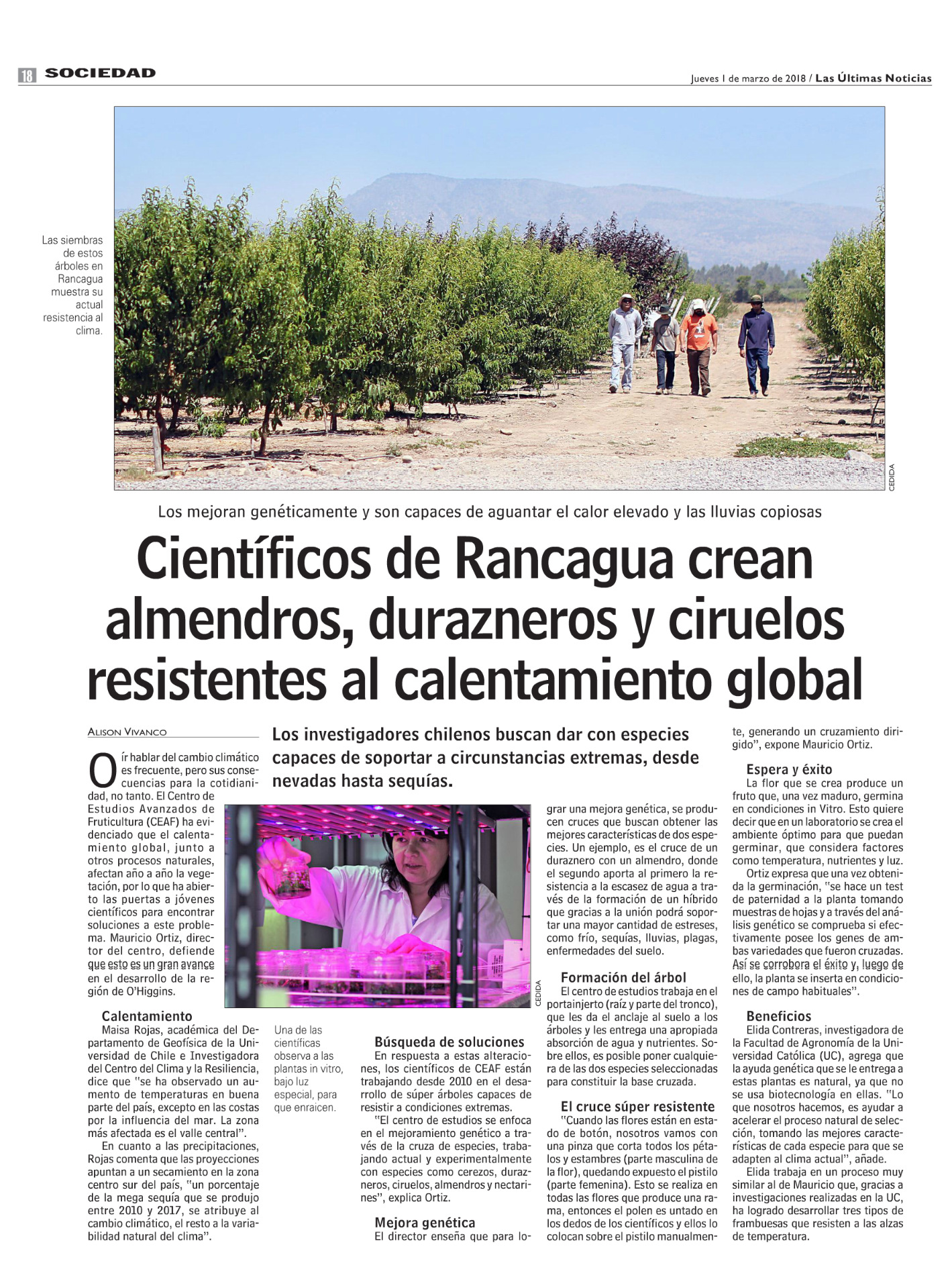Científicos de Rancagua crea almendros, durazneros y ciruelos resistentes al calentamiento global (Las Últimas Noticias)