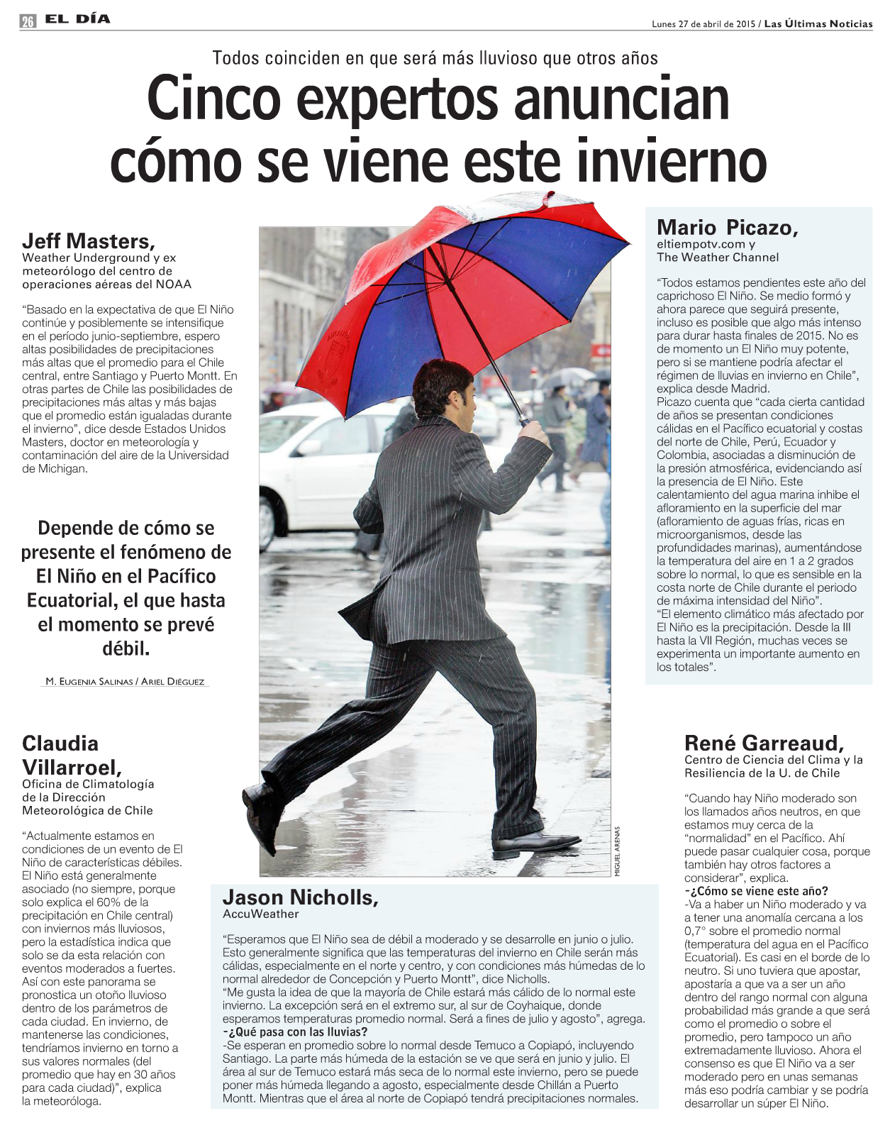 «Va a haber un Niño moderado y va a tener una anomalía cercana a los 0.7 ºC sobre el promedio normal (temperatura del agua en el Pacífico ecuatorial). Es casi en el borde de lo neutro. Si uno tuviera que apostar, apostaría a que va a ser un año dentro del rango normal con alguna probabilidad más grande a que será como el promedio o por sobre el promedio, pero tampoco un año extremadamente lluvioso. Ahora el consenso es que El Niño va a ser moderado, pero en algunas semanas eso podría cambiar y se podría desarrollar un súper El Niño».