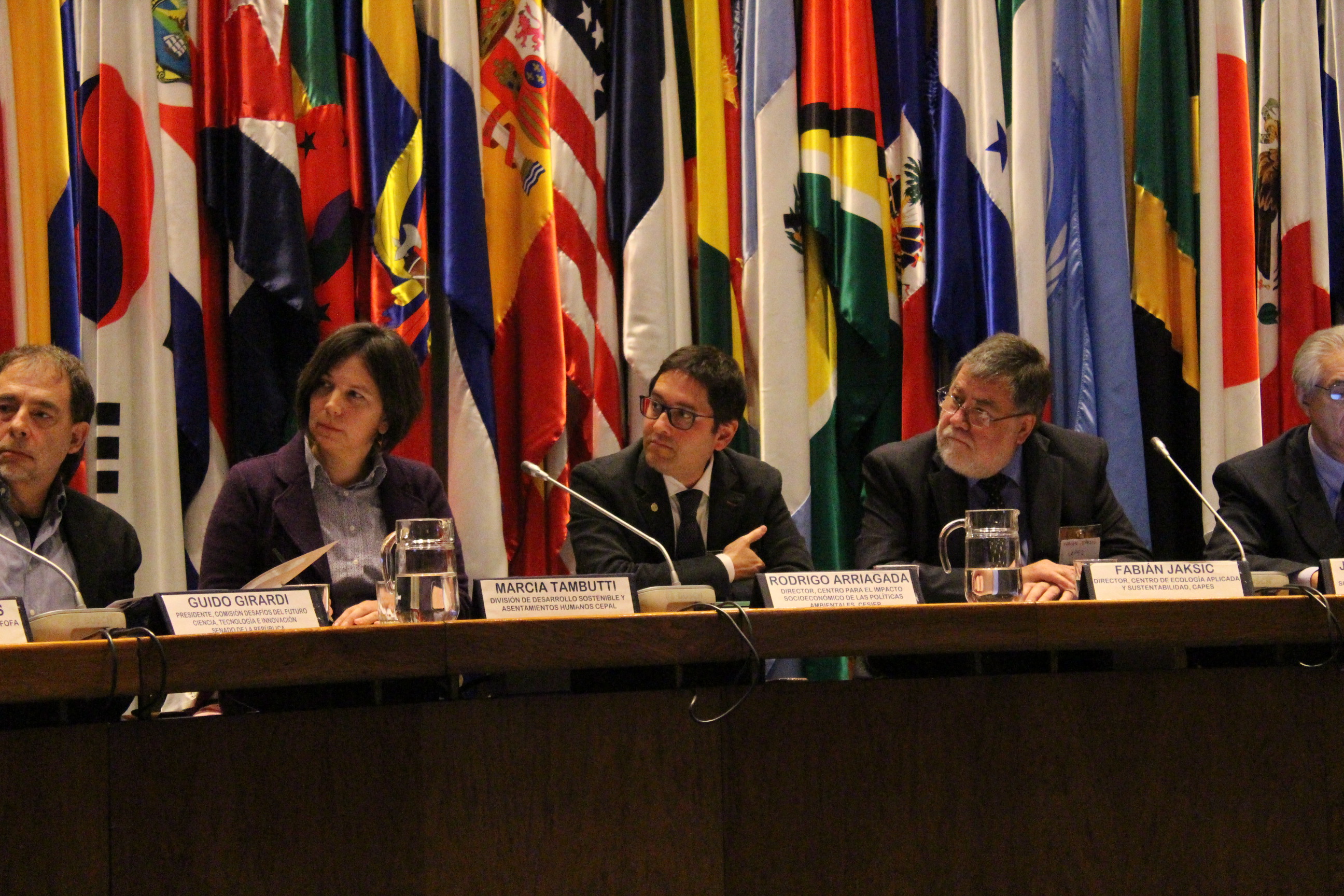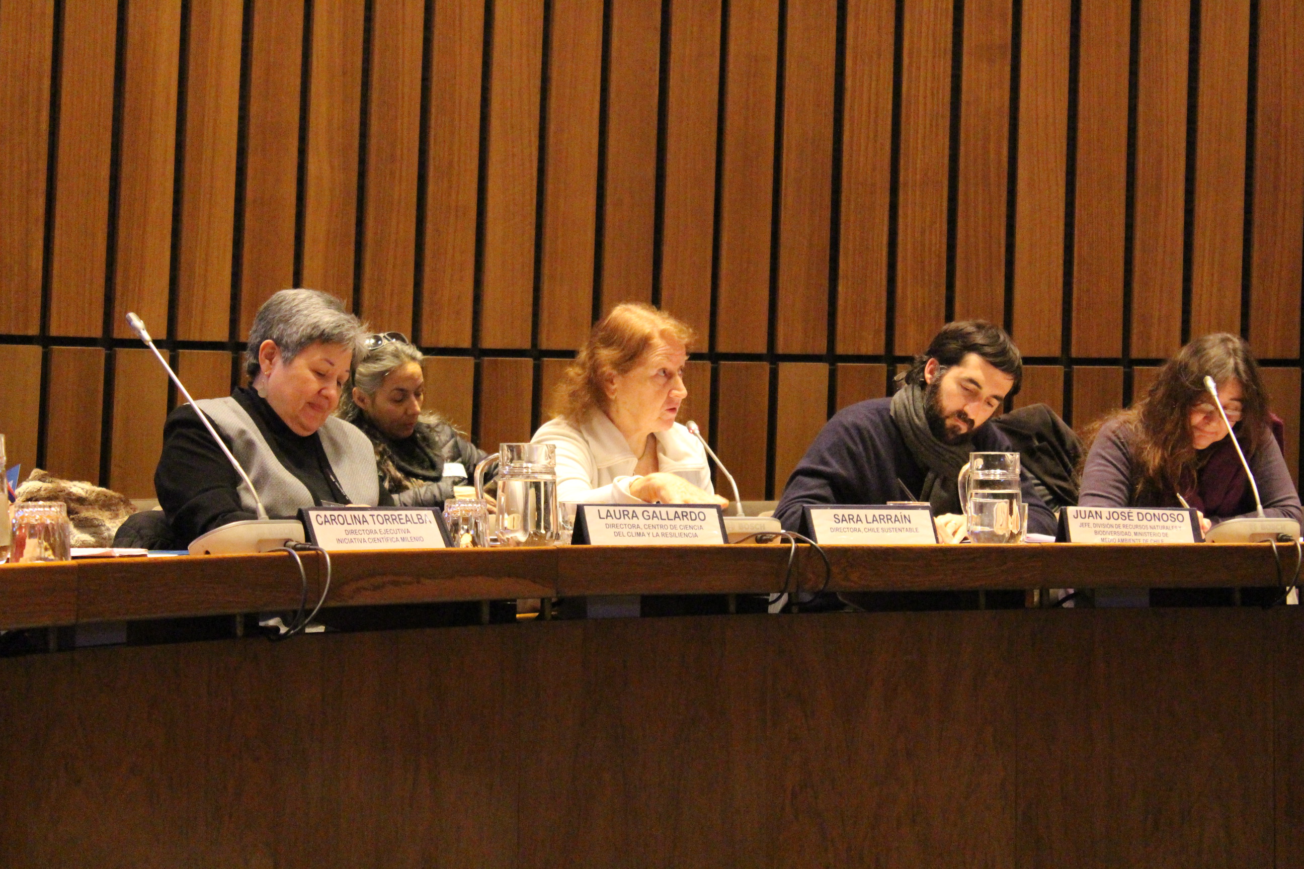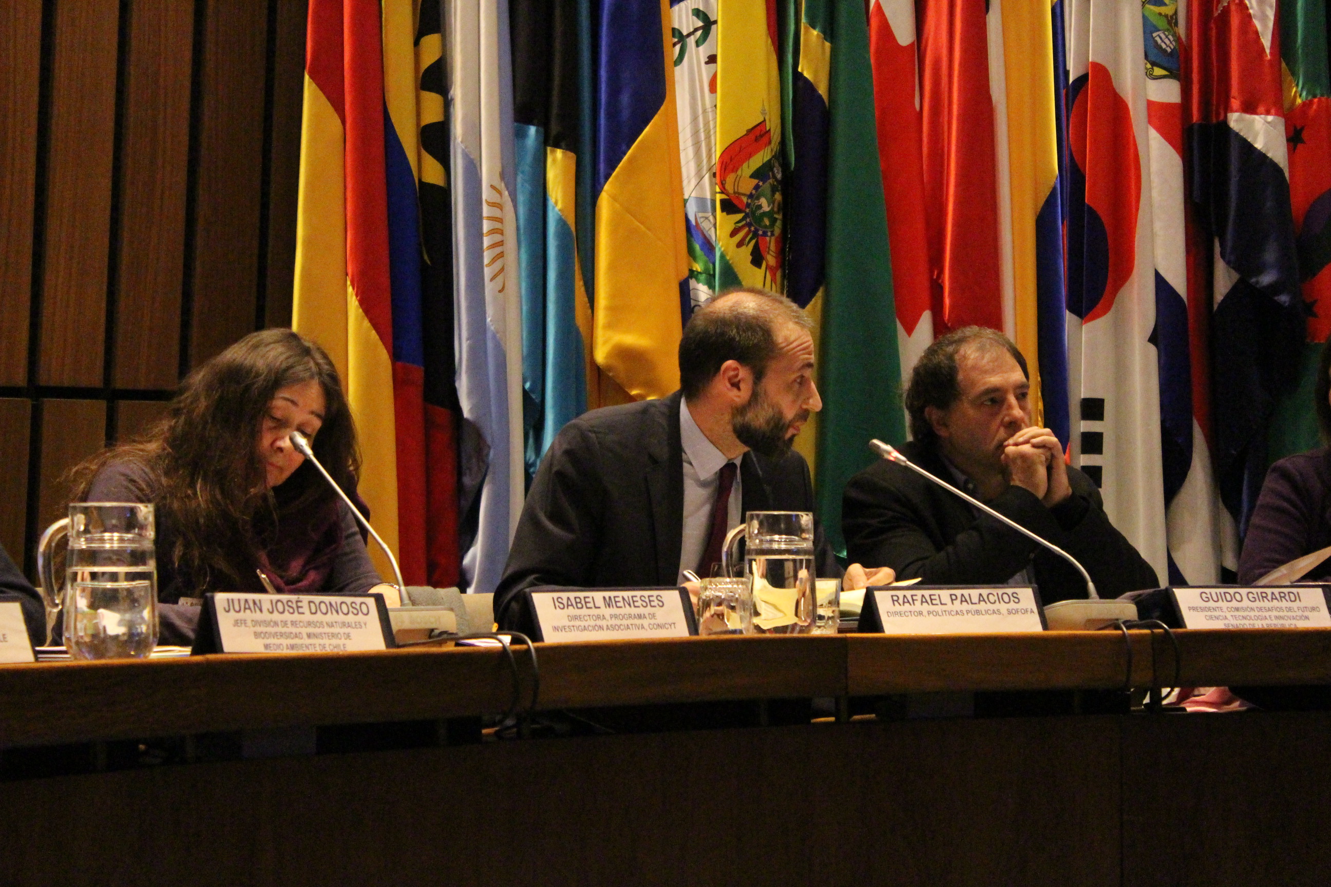 Quienes conformaron el panel en esta oportunidad fueron Rafael Palacios, director de políticas públicas de la SOFOFA, Isabel Meneses, directora del Programa de Investigación Asociativa de CONICYT, Sara Larraín, directora de Chile Sustentable, Juan José Donoso, jefe de la División de Recursos Naturales y Biodiversidad del Ministerio de Medio Ambiente, Guido Girardi, presidente de la Comisión Desafíos del Futuro, Ciencia, Tecnología e Innovación de la cámara del Senado y Laura Gallardo, directora del Centro de Ciencia del Clima y la Resiliencia (CR)2.