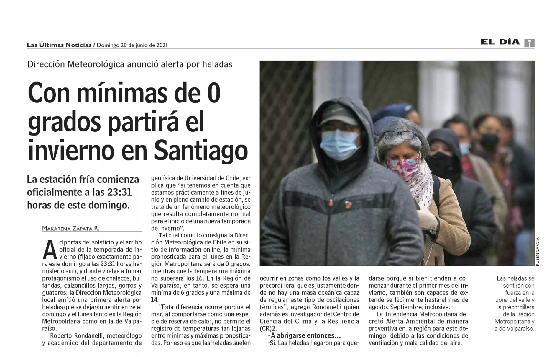 Con mínimas de 0 grado partirá el invierno en Santiago (Las Últimas Noticias)