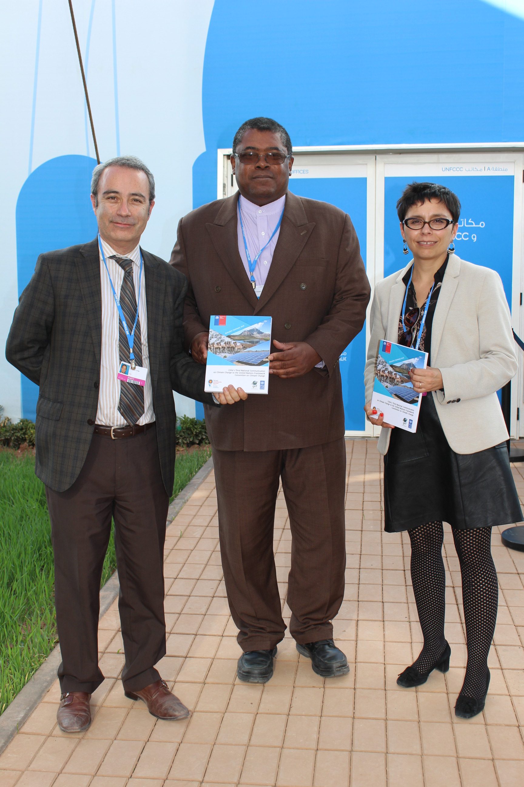 La agenda de Chile en la COP22 estuvo marcada por la presencia de la presidenta Michelle Bachelet, quien destacó el envío del Acuerdo de París al Congreso para su ratificación. También se hizo entrega oficial de la Tercera Comunicación Nacional de Chile ante la Convención Marco de las Naciones Unidas sobre Cambio Climático (CMNUCC), que detalla los avances del país en la materia durante el período 2011-2016. En la entrega participaron representantes de la CMNUCC, el Ministerio del Medio Ambiente, y el (CR)2, institución cuyos investigadores son parte de los autores del capítulo«Vulnerabilidad del país y su adaptación al cambio climático».