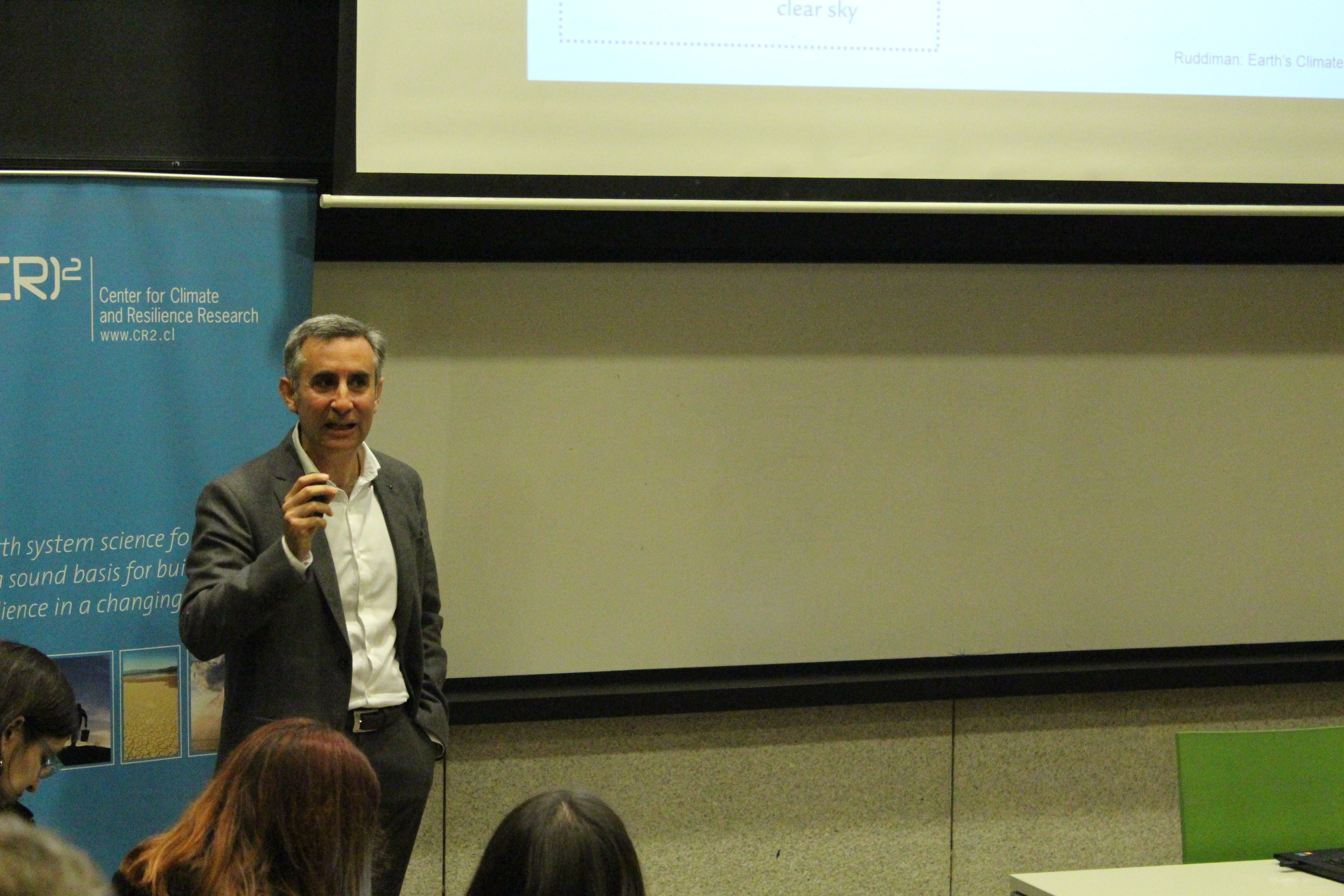 René Garreaud, subdirector del (CR)2 y académico del departamento de Geofísica de la U. de Chile, fue el encargado de dar la bienvenida a los participantes. Durante su exposición abordó la importancia de las simulaciones climáticas en un contexto de cambio climático, explicando qué son los modelos globales y regionales y cómo utilizar e interpretar correctamente la información de proyecciones climáticas.