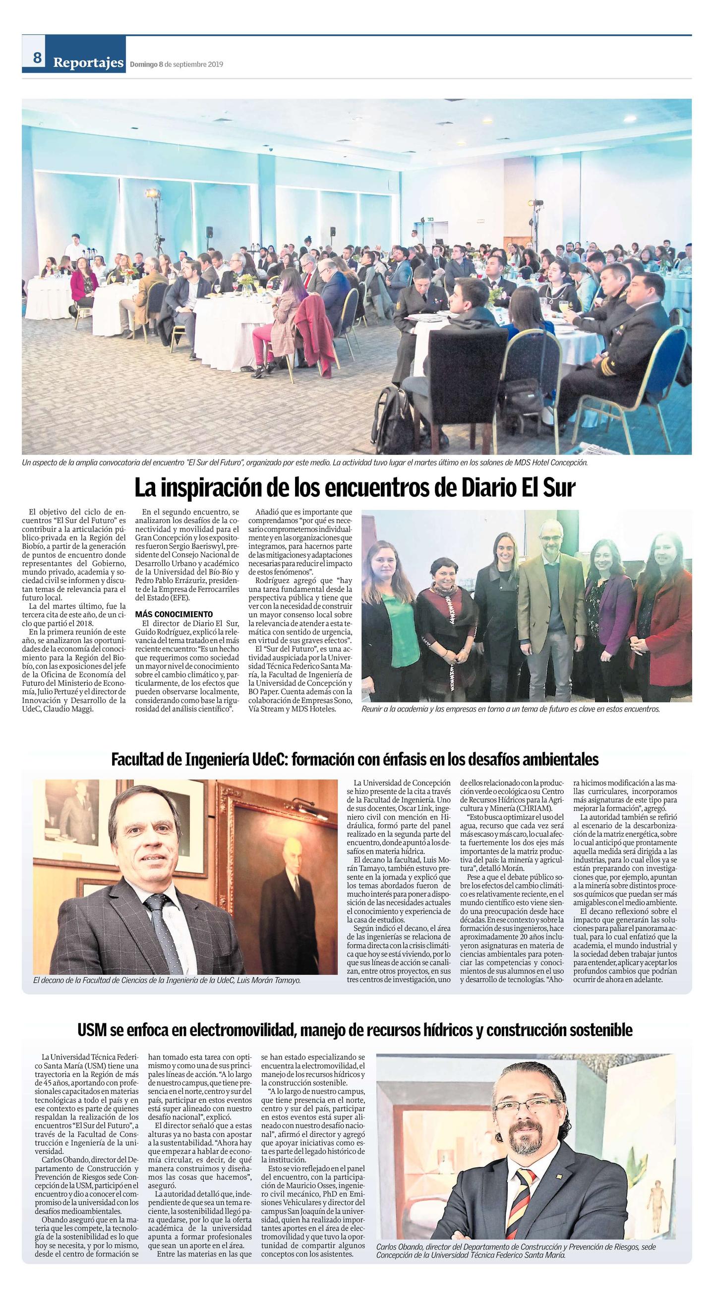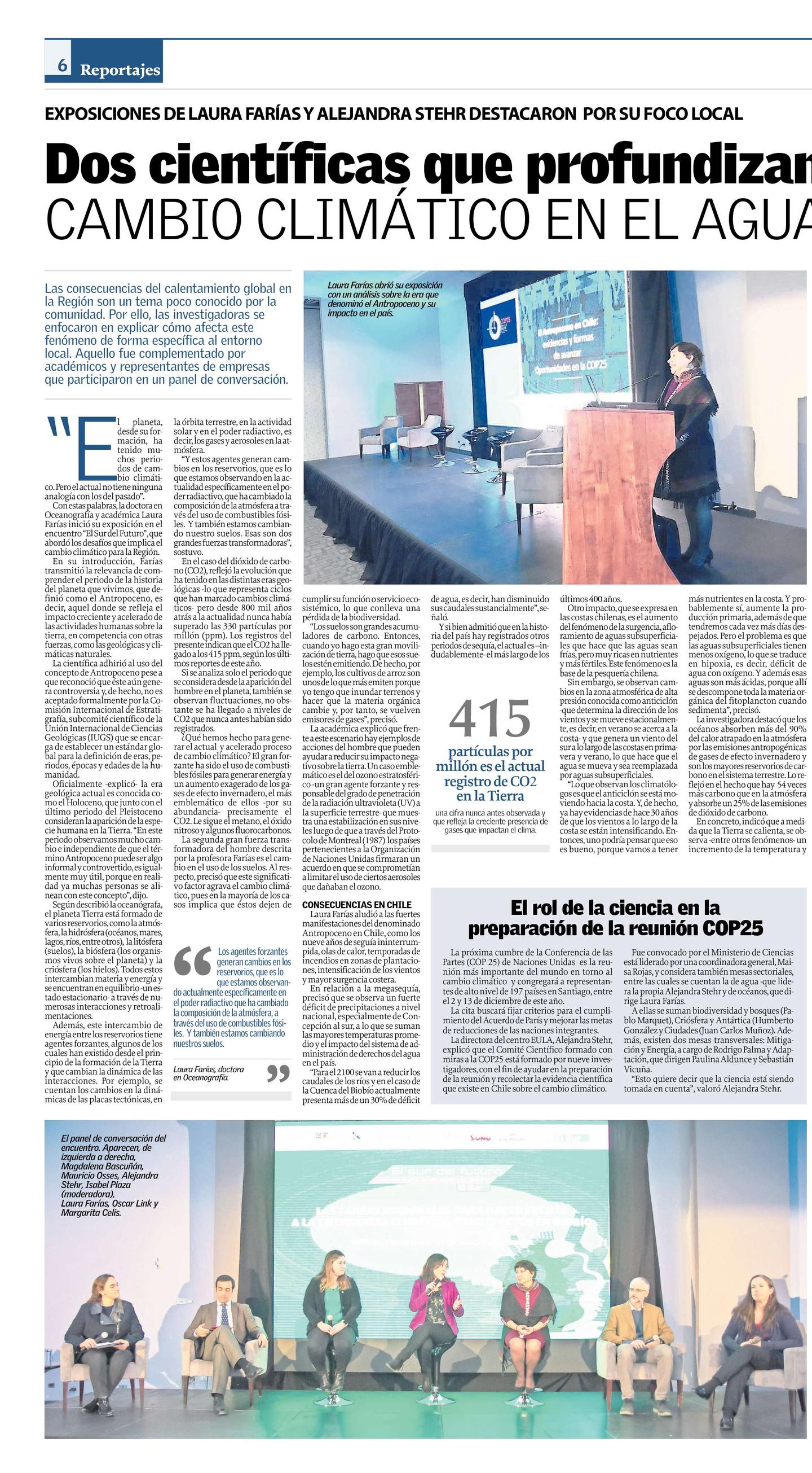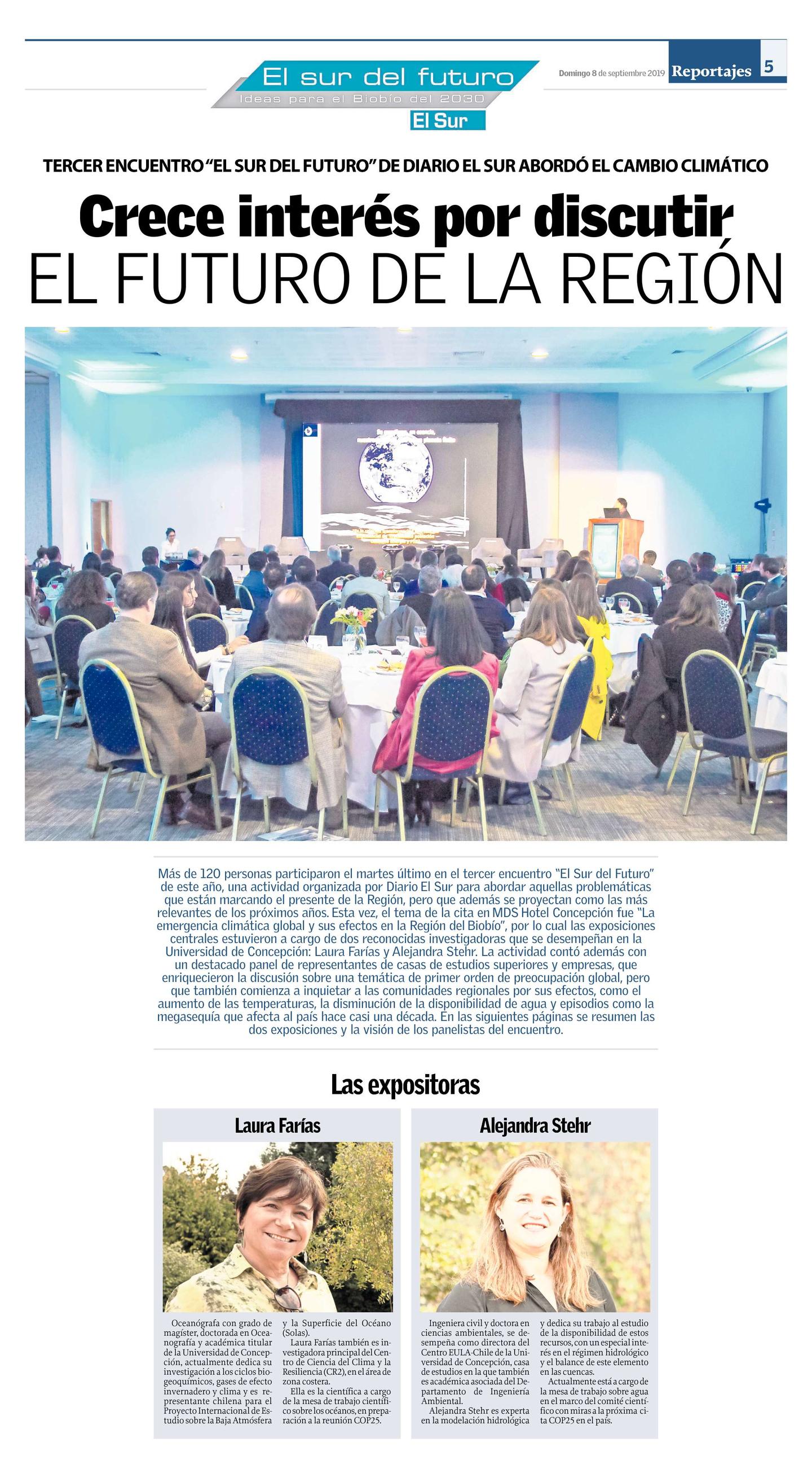 Más de 120 personas participaron el martes último en el tercer encuentro «El Sur del Futuro» de este año, una actividad organizada por Diario El Sur para abordar aquellas problemáticas que están marcando el presente de la Región, pero que además se proyectan como las más relevantes de los próximos años. Esta vez, el tema de la cita en MDS Hotel Concepción fue «La emergencia climática global y sus efectos en la Región del Biobío», por lo cual las exposiciones centrales estuvieron a cargo de dos reconocidas investigadoras que se desempeñan en la Universidad de Concepción: Laura Farías y Alejandra Stehr. La actividad contó además con un destacado panel de representantes de casa de estudios superiores y empresas, que enriquecieron la discusión sobre una temática de primer orden de preocupación global, pero que también comienza a inquietar a las comunidades regionales por sus efectos, como el aumento de las temperaturas, la disminución de la disponibilidad de agua y episodios como la megasequía que afecta al país hace casi una década. En las siguientes páginas se resumen las dos exposiciones y la visión de los panelistas del encuentro.