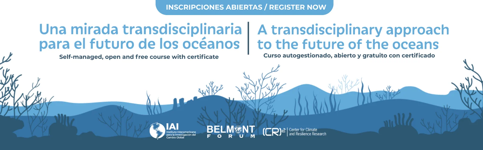 El Instituto Interamericano para la Investigación del Cambio Global (IAI), en colaboración con el Belmont Forum y el Centro de Ciencia del Clima y la Resiliencia (CR2), anuncia el inicio del curso virtual, autogestionado y con certificado “Una mirada transdisciplinaria para el futuro de los océanos”, diseñado para fortalecer capacidades en la gestión sostenible de los ecosistemas marino costeros.