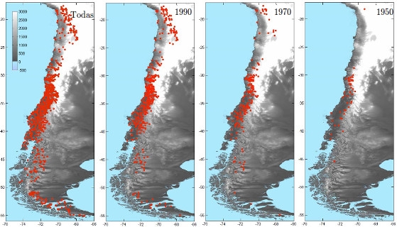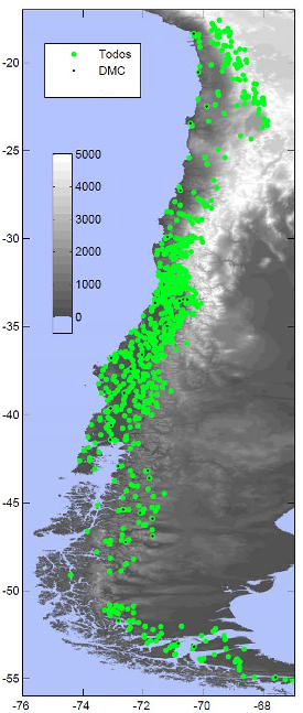 A los mismos se sumaron datos diarios de 21 estaciones de la DMC disponibles a través del Proyecto de Investigación Asociativa ACT 19 (http://www2.dgf.uchile.cl/ACT19/). Para los datos acumulados, se consideraron adicionalmente datos provenientes de [table-cell id=8 cell=E27 /] desde los anuarios de la Dirección Meteorológica de Chile.