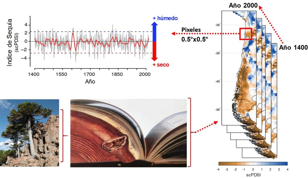 Utilizando decenas de miles de árboles de 12 especies y millones de sus anillos de crecimiento, reconstruimos como ha variado la disponibilidad hídrica en el suelo sobre gran parte de Sudamérica entre los años 1400-2000. Como métrica utilizamos el “Indice de Severidad de Sequía de Palmer auto-calibrado (scPDSI)”, el cual es una de las métricas más comunes y ampliamente usadas para caracterizar la disponibilidad hídrica en el suelo.