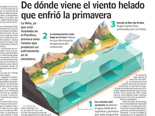 Lo primero, dice el oceanógrafo Manuel Castillo, es entender qué es La Niña. «Es un fenómeno océano-atmósfera que implica un reforzamiento de los vientos que producen surgencia tanto en el Ecuador como a lo largo de la costa». El fenómeno de surgencia -explica Castillo- es el ascenso de aguas más frías desde el fondo del océano producto del efecto de los vientos.